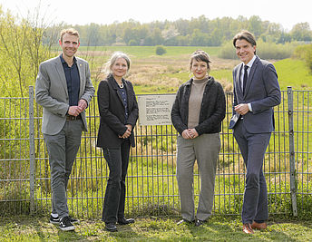 © Kirsten Neumann /EGLV. Auf dem Foto sind von links nach rechts zu sehen: Nils Böckmann (Bürgermeister), Marion Poschmann (Schriftstellerin & Autorin), Dr. Agnes Sawer (Kuratorische Leitung/Curatorial Director/Emschergenossenschaft und Lippeverband (EGLV)), Prof. Dr. Uli Paetzel (Vorstandsvorsitzender des Lippeverbandes)