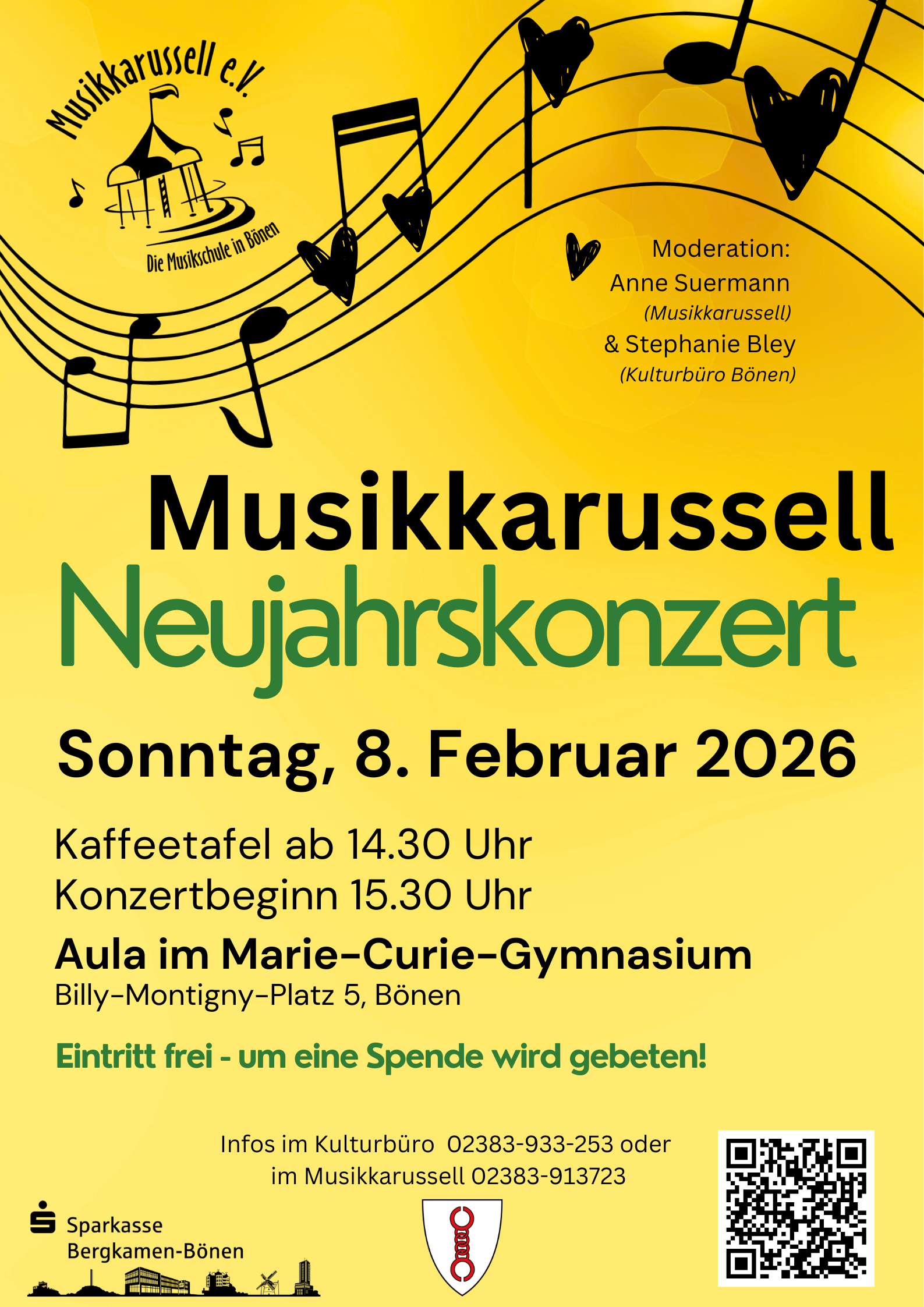 Das Konzert findet am Sonntag, den 08. Februar 2026, in der Aula des Marie-Curie-Gymnasiums in Bönen statt. Bereits um 14.30 Uhr laden die Veranstalter zu einer gemütlichen...