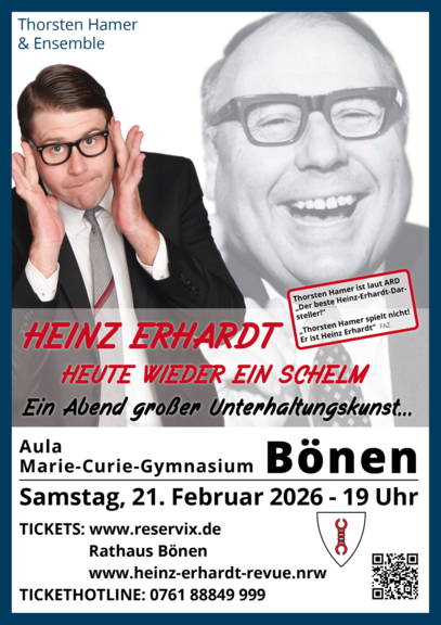 Tickets gibt es im Rathaus Bönen oder online unter: Heinz Erhardt Revue - Ein Abend großer Unterhaltung Sa. 21.02.2026 um 19:00 Uhr Tickets, Aula Marie-Curie-Gymnasium Bönen, 59199 Bönen - Karten online bestellen - Reservix - dein Ticketportal